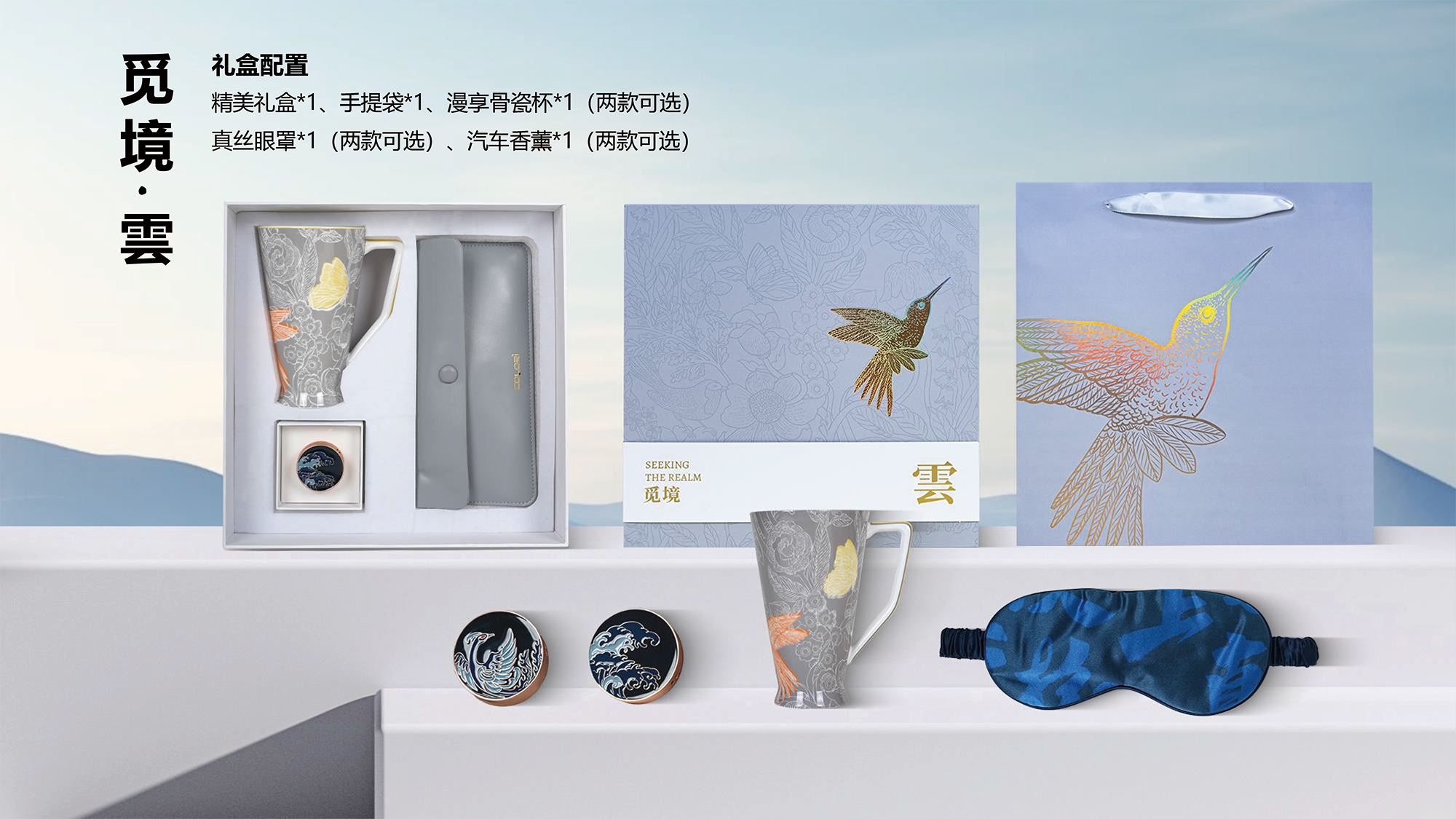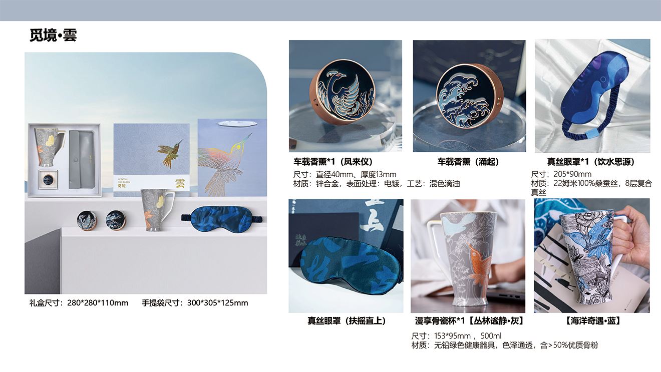 精美禮盒*1 手提袋*1 漫享骨瓷杯*1(兩款可選) 真絲眼罩*1(兩款可選) 汽車(chē)香薰*1(兩款可選)