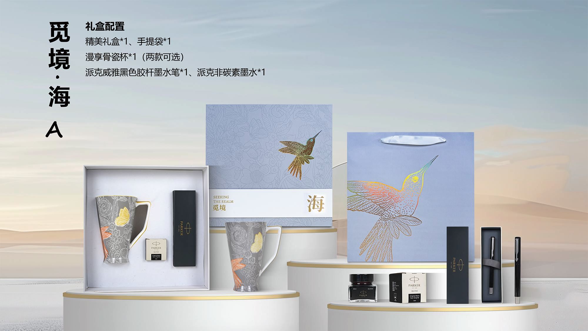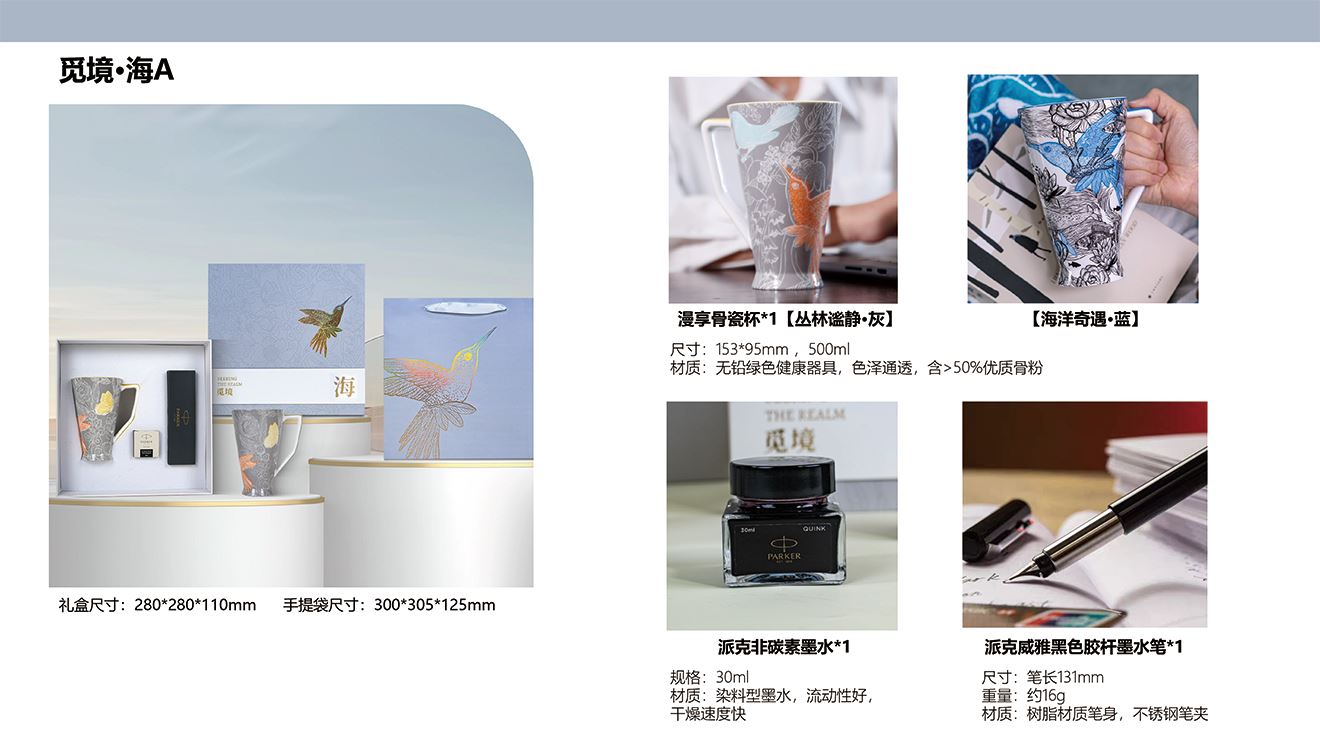 精美禮盒*1 手提袋*1 漫享骨瓷杯*1(兩款可選) 派克威雅黑色膠桿墨水筆*1 派克非碳素墨水*1